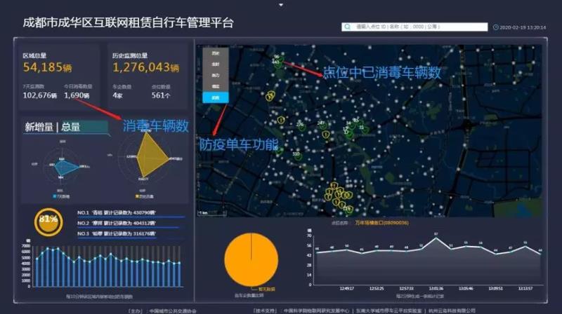互联网租赁自行车管理平台”新上线防疫监测功能可以完成共享单车:日单车消毒量、日单车消毒比例、日消毒点位量、消毒人员签到率、入库车辆动态监测等......