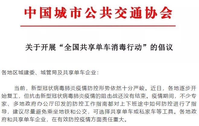 关于开展“全国共享单车消毒行动”的倡议